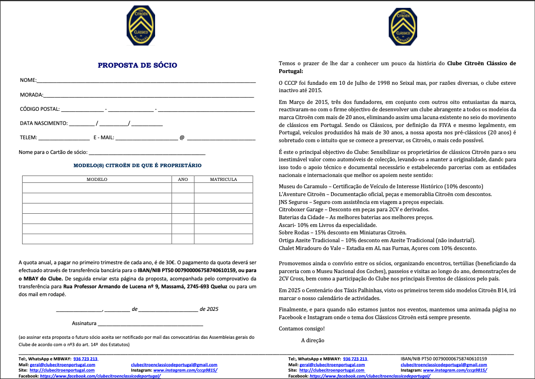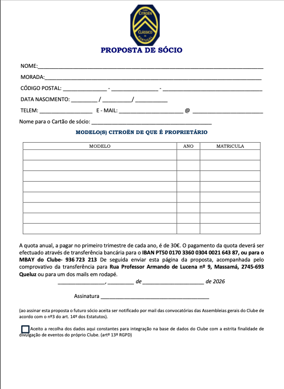 Para formalizar a sua inscrição, se assim o entender, basta submeter a sua proposta de adesão (em anexo) acompanhada do comprovativo do pagamento da quota anual no valor de 30€ e uma fotografia do seu, ou seus, Citroën com mais de 20 anos.